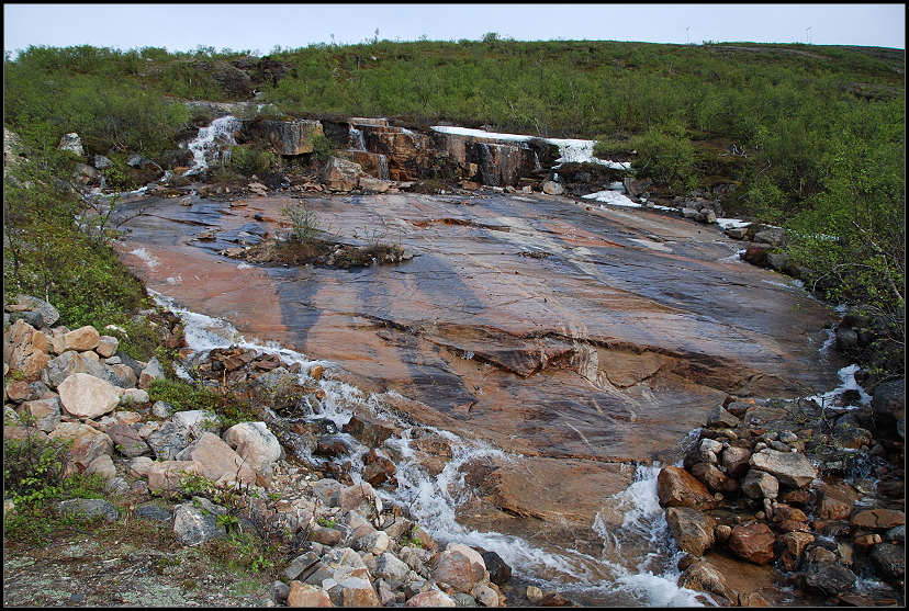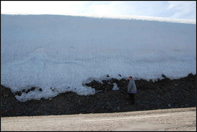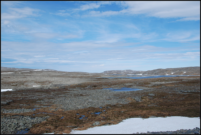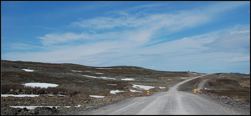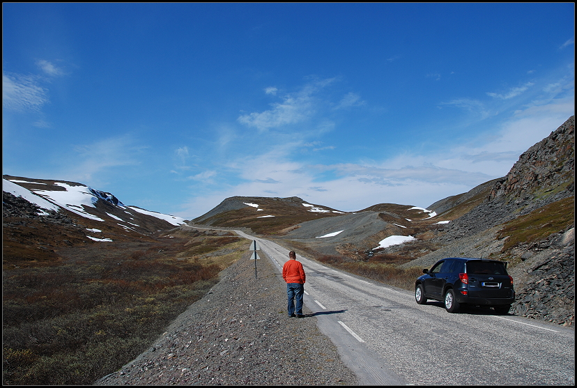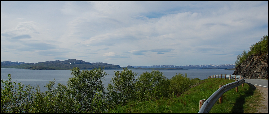 Wir schafften es wieder pünktlich um 9:00 Uhr den Campingplatz zu verlassen und fuhren die 98 Richtung Norden. Ab Vestertana machten wir einige Höhenmeter, passierten eine Schranke, die im Winter bestimmt unten ist und kamen dem Schnee so immer näher – 370 nN.