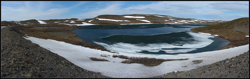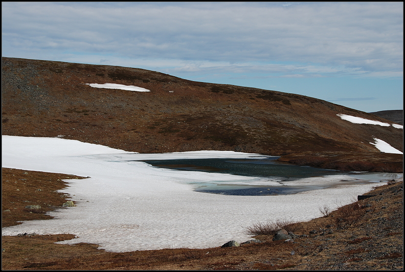 Auf den Seen lag teilweise noch Eis und Schnee. Bei einem der vielen Stopps sahen wir einen Adler über den Bergen kreisen. Für ein Bild war er allerdings viel zu weit weg. Dafür bekam ich aber einen kleinen Fuchs aufs Foto. Mit viel Fantasie kann man ihn auch erkennen.