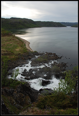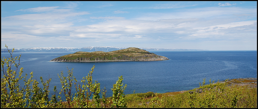In Ifjord war mal wieder Tanken (15,80 Kronen; 2,10 €) angesagt. Bevor es damit losging musste Tom allerdings erst im kleinen Café nebenan Bescheid sagen, damit die Spritpumpe angestellt wurde. Anschließend nahmen wir den Abzweig nach Mehamn, die 888. Die Straße schlängelte sich am Fjord entlang, es ging leicht rauf und runter. Rechts von uns Birkenwäldchen, die hier auf Meereshöhe wieder Blätter hatten und links das Wasser. Im Hintergrund Berge auf denen Schnee lag, wunderschön!! Unterwegs gab es immer wieder Fotostopps. Es war aber auch so schön dort!