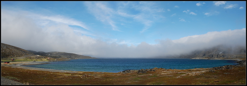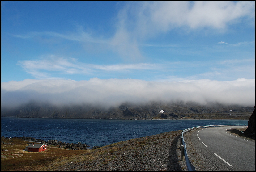 In Mehamn bogen wir nach rechts ab und folgten der Straße nach Gamvik. Hinter der nächsten Kurve wartete ein toller Anblick auf uns. Hinter den Bergen stauten sich die Wolken und krochen langsam über den Bergrücken, ehe sie sich im Tal auflösten.