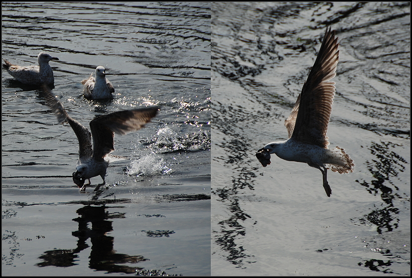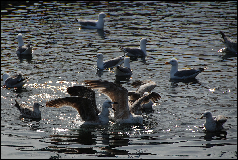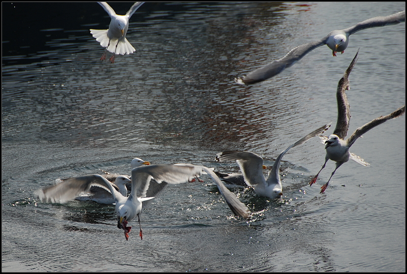 Zum Glück schien in Mehamn die Sonne wieder, als wir dort parkten und in einem Supermarkt Sachen fürs Mittagessen kauften. Auf einer Bank am kleinen Hafen zauberten wir uns leckere Sandwiches und wärmten unsere Gesichter in der Sonne. Dabei beobachteten wir einen Haufen Möwen, die sich immer wieder dicke Fischstücke schnappten, die ein Mann ins Wasser warf.