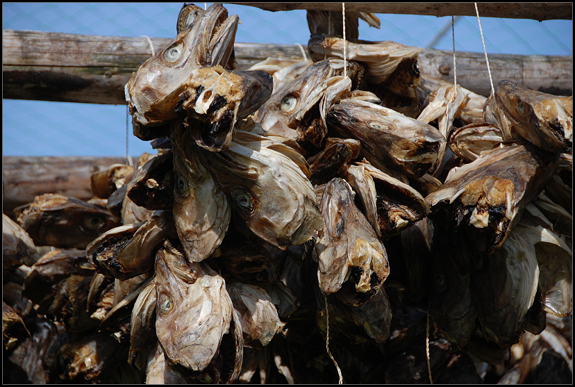 Auf der anderen Seite vom Hafen sahen wir Stockfischgestelle stehen. Erst als wir dort ankamen bemerkten wir, dass sie noch voll mit Fischen hingen. Wir hatten gedacht, dass die schon längst abgenommen worden waren. Stockfisch ist Kabeljau. Der frisch gefangene Fisch wird ausgenommen und der Kopf wird entfernt. Dann wird er gesalzen und zum Trocken an die Luft gehangen. Dementsprechend riecht es auch in der Umgebung solcher Gestelle. Pfui!! Bäh! Die Köpfe werden übrigens nicht weggeworfen, sondern ebenfalls getrocknet und nach Afrika exportiert.
