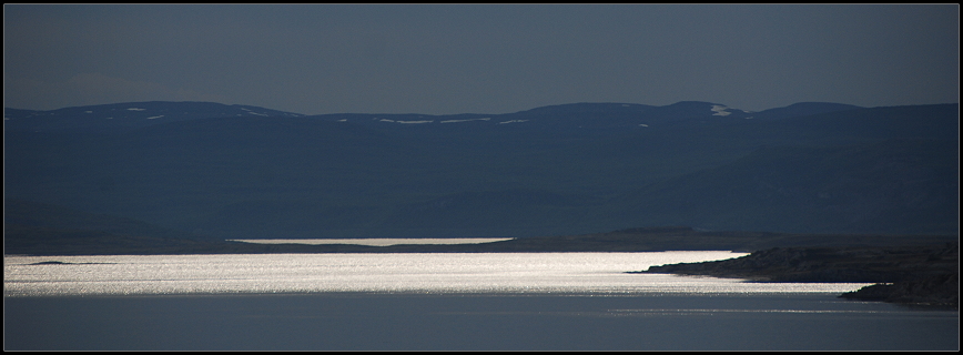 Ab Bekkarfjord führte die Straße uns wieder aufwärts und vom Fjord weg. Auf 346 nN pfiff wieder ein kalter Wind und Bäume tauschten ihren Platz mit Schneefeldern. Immer wieder standen Rentiere an den Berghängen und grasten mit ihren Jungen. Die Kleinen waren durch ihre braune Färbung so gut getarnt, dass man sie oft gar nicht sah.