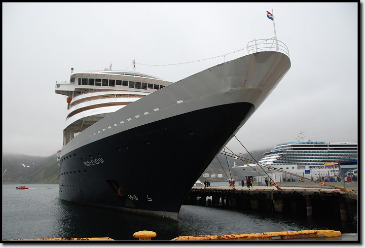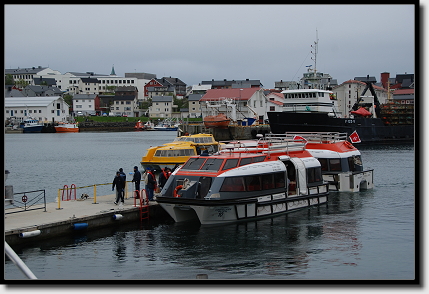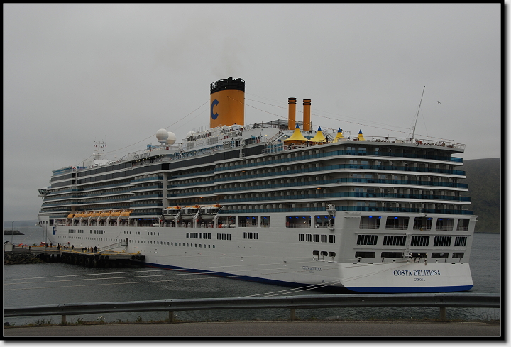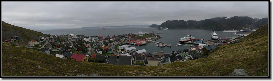 In der Gemeinschaftsküche warfen wir kurz den Rechner an und schauten auf die Webcam vom Nordkap. Alles war in Nebel gehüllt und so beschlossen wir erst einmal nach Honningsvåg zu fahren. Als wir den Weg zum Hafen runter fuhren, waren wir echt überrascht. Es lagen vier Kreuzfahrtschiffe und ein Schiff der Hurtigruten vor Anker. Damit hatten wir nicht gerechnet. Scheint wohl ein beliebter Ort zu sein. ;-)