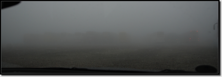 Die Einfahrt zum Parkplatz nur erahnend, tasteten wir uns langsam vorwärts. Als Tom den Motor endlich ausmachte, blickten wir ungläubig durch die nasse Windschutzscheibe. 17 (!!!) Busse sahen wir schemenhaft auf dem Parkplatz stehen. Unfassbar!!