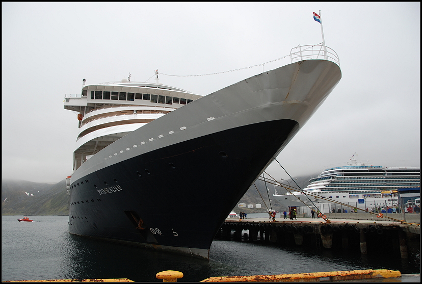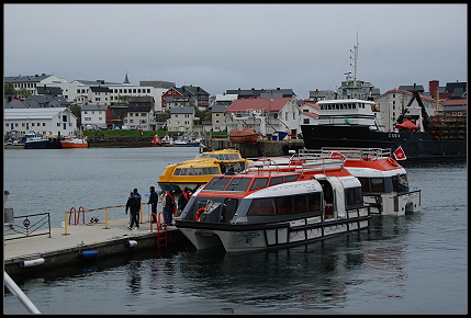 In der Gemeinschaftsküche warfen wir kurz den Rechner an und schauten auf die Webcam vom Nordkap. Alles war in Nebel gehüllt und so beschlossen wir erst einmal nach Honningsvåg zu fahren. Als wir den Weg zum Hafen runter fuhren, waren wir echt überrascht. Es lagen vier Kreuzfahrtschiffe und ein Schiff der Hurtigruten vor Anker. Mit so viel “Rummel” hatten wir nicht gerechnet.