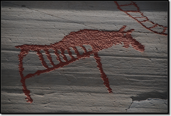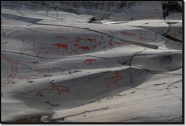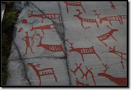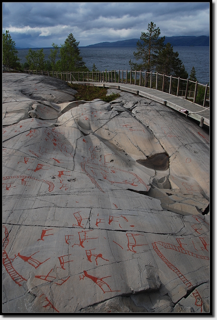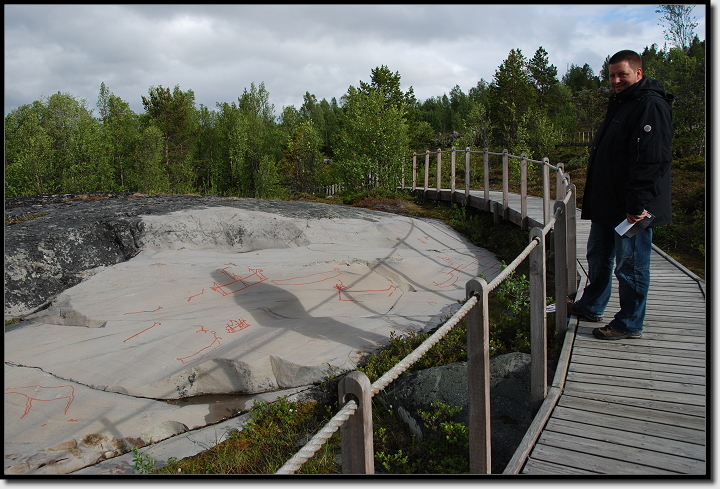 Viele verschiedene Motive konnten wir sehen. Hauptsächlich Tiere, besonders Rentiere und Elche. Für die Besucher wurden sie mit roter Farbe ausgemalt, um sie besser erkennen zu können. Was die Ritzungen wohl zu bedeuten haben? Die Broschüre, die wir an der Kasse bekommen haben, lieferte Antworten. Dort ist alles wunderbar erklärt. Also, hinfahren und anschauen!