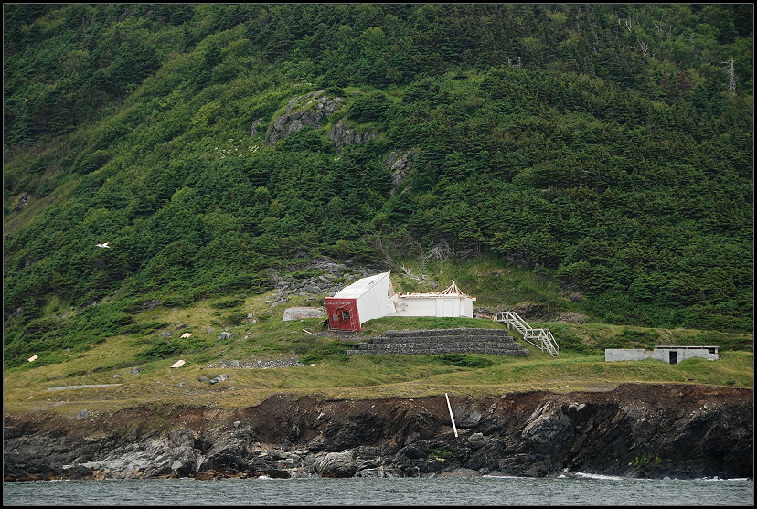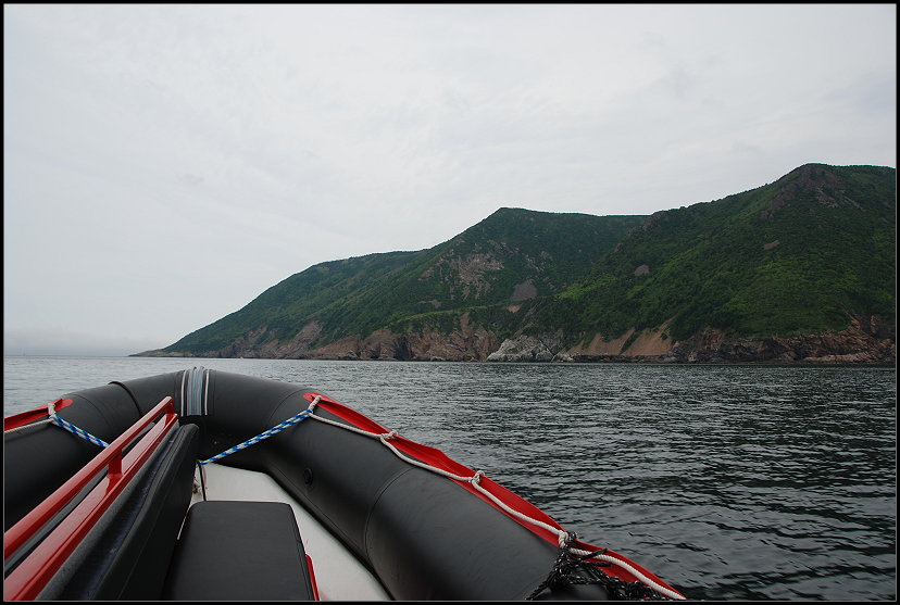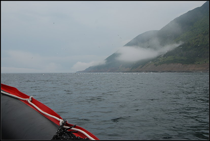 In Bay St. Lawrence angekommen, wollen wir auch noch die dritte Waltour unserer Rundfahrt buchen. In einer kleinen Hütte hängt ein Schild mit der Aufschrift „Nächste Tour um 16:30 Uhr“. Blöd, jetzt ist es erst kurz nach 12:00 Uhr, so lange wollen wir nicht warten. Plötzlich kommt ein Auto angebraust und eine Frau steigt aus. „Ihr wollt eine Waltour machen? Dann kommt mit“. In einer, ich sag mal „Bruchbude“ knöpft sie uns auf nette Art und Weise 90 Dollar ab und schon haben wir eine Tour gebucht. Und zwar mit einem Zodiac! Na, das wollte ich ja eigentlich nicht. Mmmh, mal sehen…..