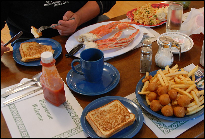 Aber bevor wir uns positionieren, fahren wir noch mal ein Stück die Straße zurück und gehen im Restaurant etwas essen. Auf dem CP gibt es nämlich keinen Grill und auch kein Feuerholz. So essen wir lieber etwas im Lokal. Tom bestellt Schneekrabbe und ich Scallops. Die Schneekrabbe ist oberlecker. Den Geschmack kann man gar nicht beschreiben. So zart und mild. Mmmmh, einfach köstlich.