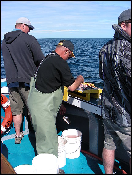 Pünktlich um 8:00 Uhr tuckern wir aus dem Hafen. Lee erklärt uns die Angeln, während Brad den Kahn aufs offene Meer steuert. Nach einer viertel Stunde stoppt er und gibt uns ein Zeichen: Angeln ins Wasser! Kaum hängen diese drin, hat auch schon der Erste eine Makrele am Haken. Und jetzt geht es Schlag auf Schlag. Lee hat alle Hände voll zu tun, eine Makrele nach der anderen wird aufs Boot geholt. Er entfernt sie von dem Haken und befördert sie in eine Kiste. Nur die Heringe werden wieder über Bord geworfen, sie dürfen weiterleben.