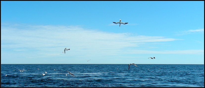 Nach noch einem kurzen Stopp über einem Makrelenschwarm fahren wir zurück zum Hafen. Auf dem Weg sehen wir noch einen Minkwal. Zig Möwen und Gannets begleiten uns, da Lee die Fische ausnimmt und alles Überflüssige über Bord geht.