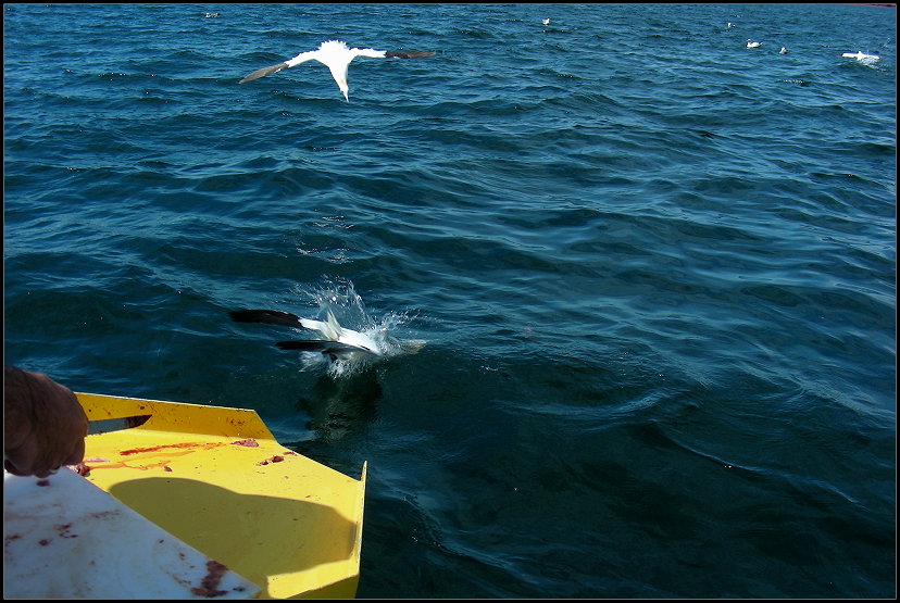 Viele davon aber auch nur für kurze Zeit, denn die Möwen und die Gannets haben natürlich mitbekommen, dass es hier was zu fressen gibt. Mit einem Affenzahn schießen die Gannets vom Himmel und tauchen ins Wasser ein. Einige nur Zentimeter von der Reling entfernt. Wir müssen aufpassen, dass wir sie mit der Angel nicht treffen und dass sie uns die Fische von selbiger nicht klauen. Lee und ich werden fast von einem lebensmüden Gannet getroffen, als er nur wenige Millimeter an unseren Köpfen vorbei ins Wasser schießt. Bekloppte Vögel!