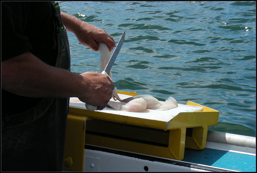 Am Dock angekommen verteilt Lee Tüten mit Makrelenfilets (in unserer sind 20 Stück) und Tom bekommt natürlich auch seinen Dorsch filetiert.