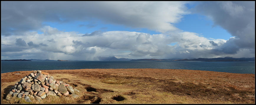 Erst ging es über einen flachen Bach und dann den Hügel hoch. Dabei genossen wir die schöne Aussicht auf die Summer Isles und die Berge. Nur die dicken Regenwolken, die sich dort entleerten, machten uns etwas Sorgen.