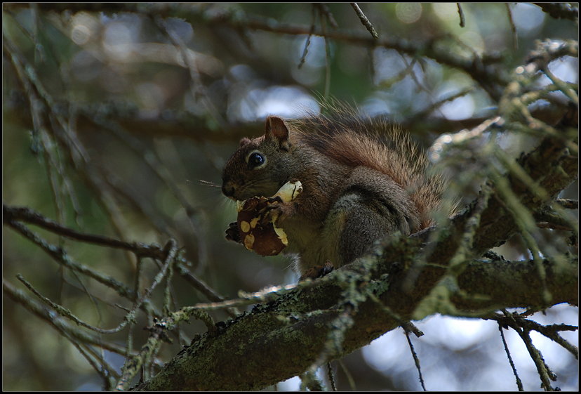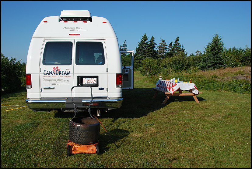 Die Sonne weckt uns, wie schön. So frühstücken wir mit unserer neuen Kanada-Tischdecke draußen.