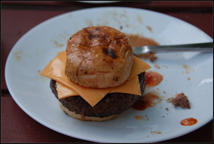 Der CP dort ist schon gut belegt, es ist ja auch Freitag. Zum Abendbrot gibt es dann mal wieder Burger. Ich hole die Packung aus dem Eisfach und gucke nicht schlecht, als 6 statt 8 Fleischscheiben auf dem Teller liegen. Da haben wir uns wohl verlesen. 6x8oz! Hilfe!! Unsere Brötchen sind viel zu klein und den Salat lassen wir heute lieber weg. Was für Klopper!