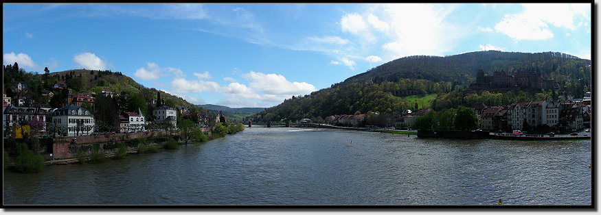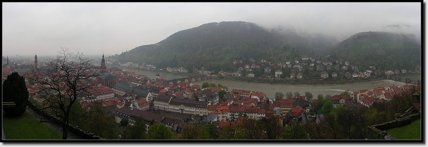 Wir schlenderten eine Weile umher und gingen dann hinunter zum Weinkeller, zum großen Fass. Dieses wurde 1751 gebaut und fasst heute noch 219.000 Liter. Da es aber wohl nie richtig dicht war, wurde es nur dreimal gefüllt. Anschließend gingen wir zu einem Aussichtspunkt, von dem aus wir trotz Regen und Wolkenschwaden einen wunderbaren Blick auf den Neckar, die Karl-Theodor-Brücke und die Altstadt hatten.