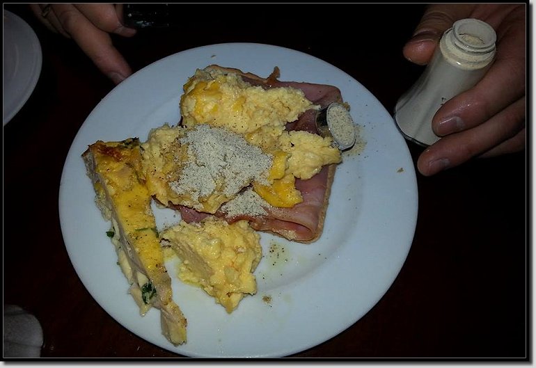 Der Frühstücksraum war nicht besonders groß, aber da es erst 9:00 Uhr war, hatten wir noch eine fast freie Tischwahl. Die Auswahl an Essbarem war echt gut und es schmeckte uns auch alles. Nur der Orangensaft war viel zu süß, aber damit konnten wir leben. Tom konnte allerdings nicht mit seinem verpfefferten Toast leben… Der Klassiker!