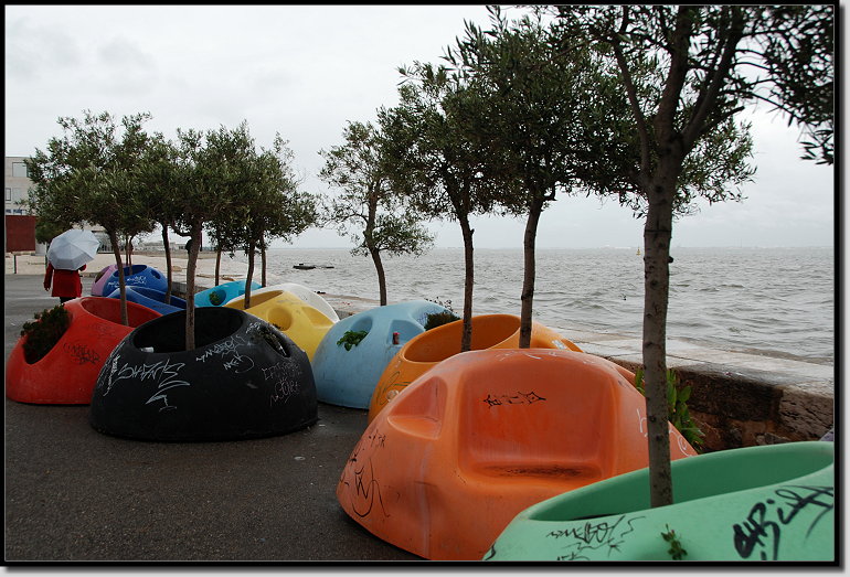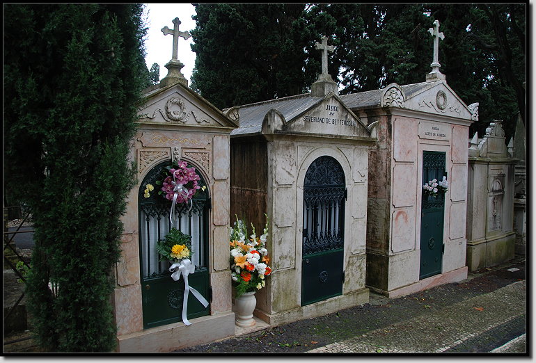 Es war richtig interessant sich dort umzuschauen, aber auch ein wenig gruselig. Vom hinteren Teil des Friedhofs hatten wir trotz Nieselregen einen netten Blick auf den Tejo, den Cristo-Rei und die schöne rote Brücke des 25. April. Da noch ein bisschen Sonne und … na ja, lassen wir das!