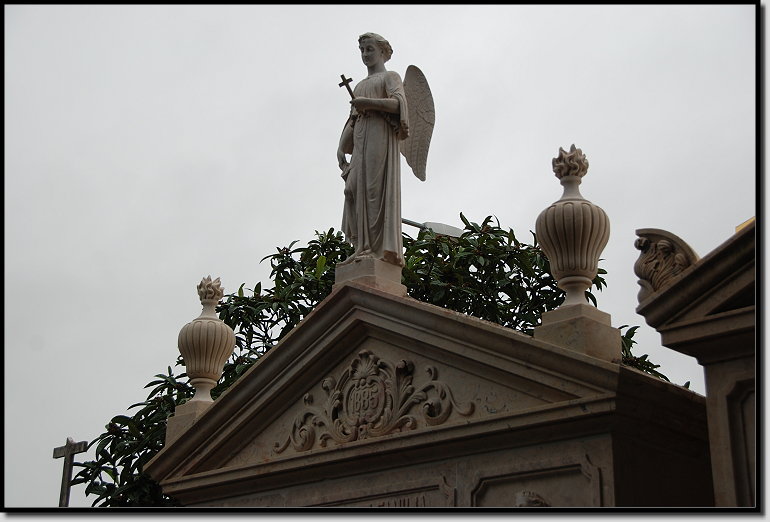 Dort empfing uns eine sehr nette Dame vom Securityservice. Sie hatte 15 Jahre in Deutschland gelebt und freute sich sehr, mit uns deutsch reden zu können. Uns freute es natürlich auch. Sie gab uns einen Plan, auf dem einige „wichtige“ Gräber eingezeichnet sind. Dann marschierten wir drei los. Der Friedhof ist mal so ganz anders, als alle die wir schon gesehen hatten. Zwischen meterhohen Zypressen bilden kleine weiße Grabhäuschen eine Miniaturstadt. In viele Häuschen konnten wir hineinschauen und sahen die unterschiedlichsten Särge dort liegen. Manchmal bis zu sechs Stück ordentlich übereinander gestapelt. Es standen Bilder der Toten und Blumen in Vasen in den Totenhäuschen.