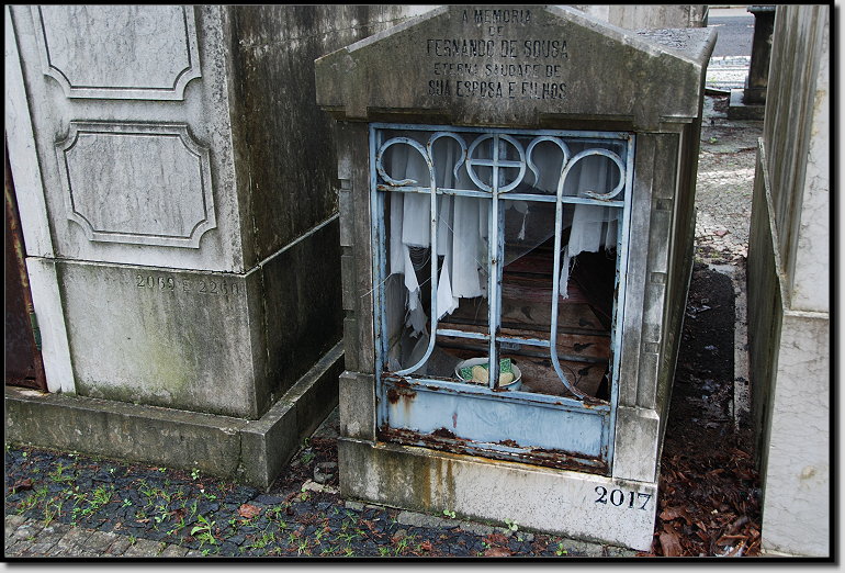 Da wir uns den Friedhof Cemitério dos Prazeres für heute als Besichtigungspunkt rausgesucht hatten und dahin leider keine Metro fuhr, schwangen wir uns in ein uraltes Taxi. Das Ding hatte 300.000 km auf der Uhr. Nix funktionierte, weder Licht, noch Lüftung, noch der erste Gang. Dennoch kamen wir heile für 6,- Euro am Friedhof an.