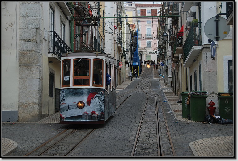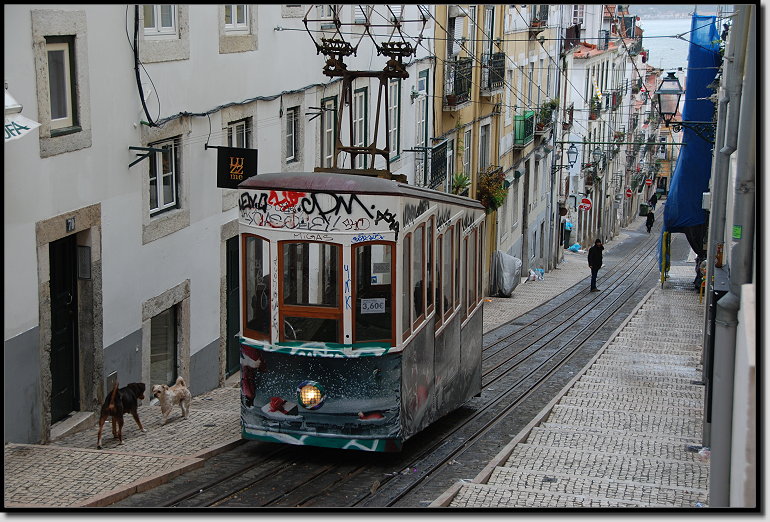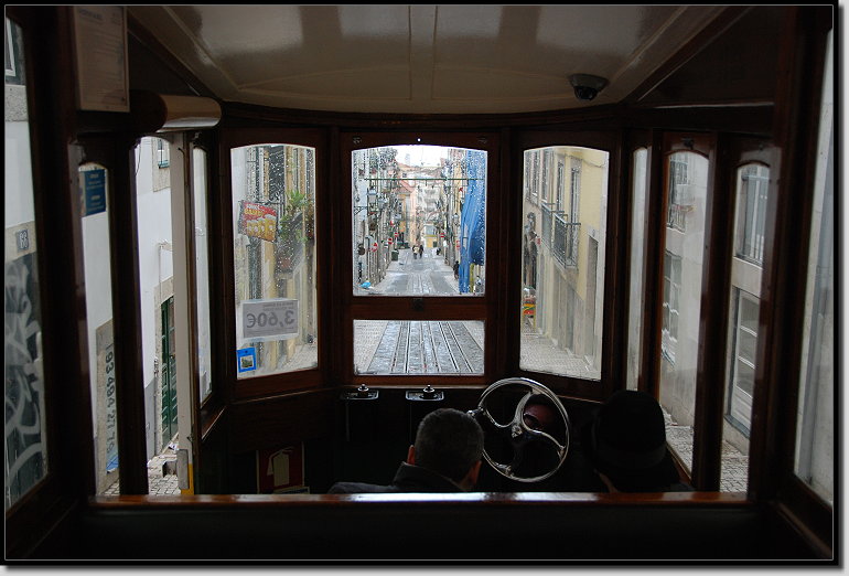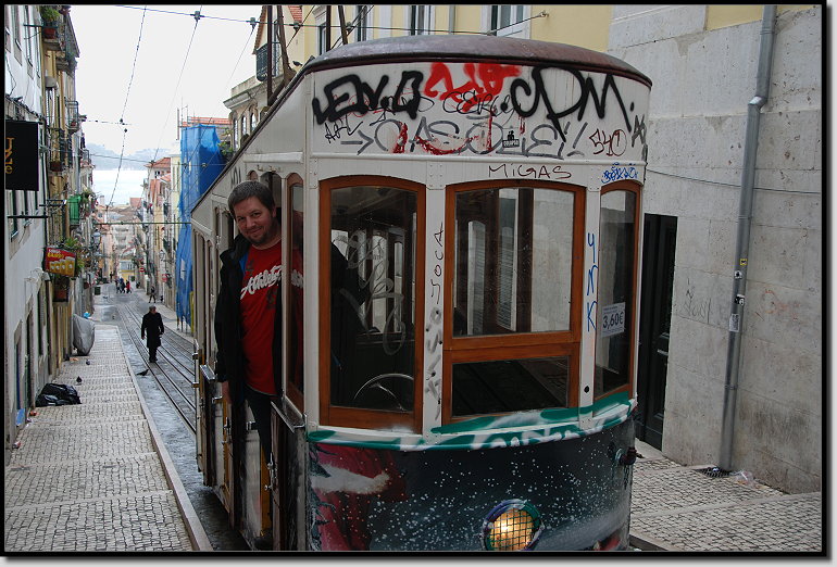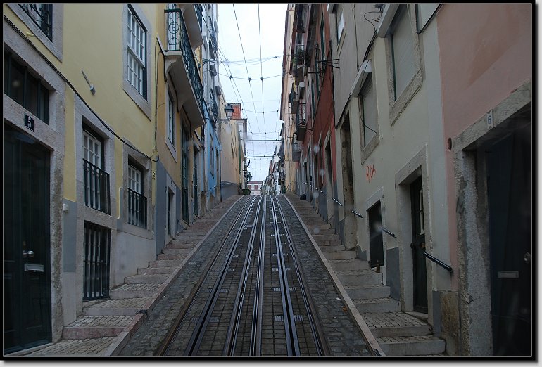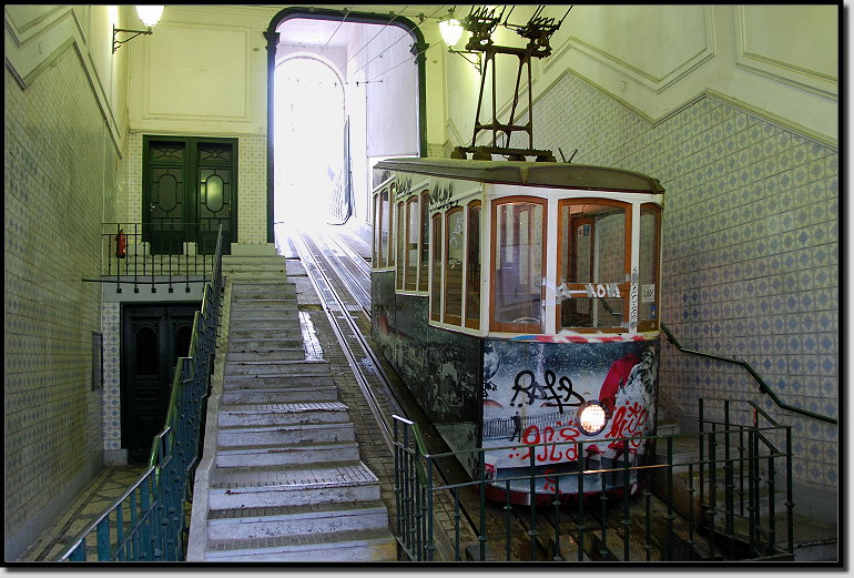 Eigentlich wollten wir nun mit der Linie 28 wieder ein Stück weiterfahren, aber da diese ja nun mal streikten... Ach ja, das erzählte uns übrigens die nette Securitydame vom Friedhof. So hielten wir noch mal ein Taxi an und ließen uns zum Elevador da Bica von 1892 fahren. Da es in Lissabon ständig bergauf und bergab geht und niemand große Lust hat, die Hänge ständig rauf und wieder runter zu laufen, erklimmen alte Standseilbahnen die steilsten Gassen der Stadt. So auch im Stadtviertel Bica. Mit unserer „7 Colinas Card“ war die Fahrt sogar umsonst. Super, dann mal alle einsteigen! Rumpel rumpel ging es abwärts.