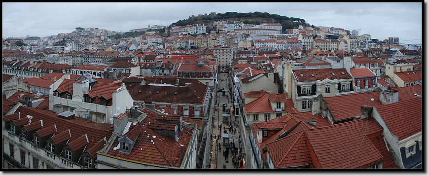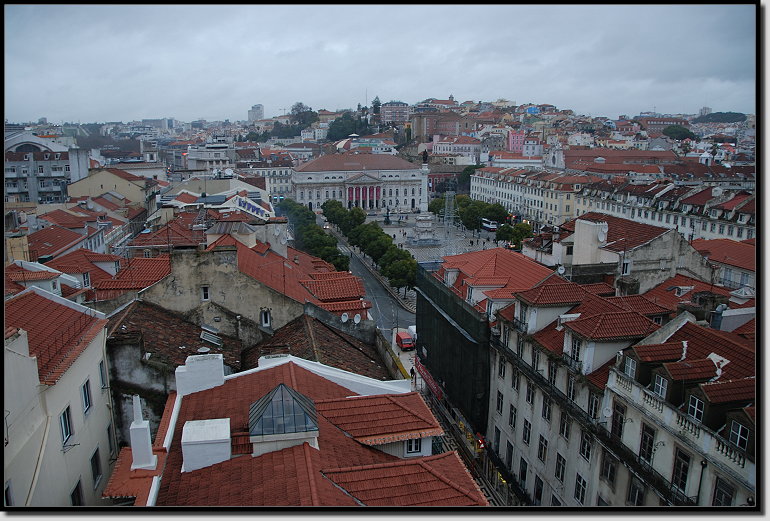 Es hatte sich mittlerweile eine kleine Schlange vor dem Eingang gebildet und wir reihten uns brav ein. Als wir dann einsteigen durften, freuten wir uns, dass wir die 5,- Euro für die Hoch- und Runterfahrt nicht zahlen mussten. Auch diese Fahrt war in unserer „7 Colinas Card“ mit drin. Oben angekommen hatten wir einen herrlichen Ausblick über die Baixa mit dem Prachtplatz Rossio, den vielen roten Dächern der Unterstadt bis hinüber zum Castelo de São Jorge.