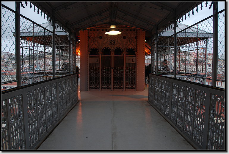 Bevor wir uns in die Höhe begaben wollten wir aber erst mal etwas essen. Die Wahl fiel auf das „Concha D`Ouro“ und es war eine schlechte Wahl. Vom Kellner bekamen wir ungefragt Schinken, Käse, Oliven, Brötchen und Butter als Vorspeisen serviert (ist wohl in Portugal nicht unüblich). Unser Fehler, wir hätten sie sofort zurück gehen lassen sollen. Stattdessen dachten wir noch, der Schinken wird ja wohl keine 13,- Euro kosten. Mmmh, kostete er aber doch und auch jedes kleine Pöttchen Butter mussten wir mit 2,- Euro bezahlen. So waren wir am Ende zu dritt mit je einem Getränk 97,- Euro los!!! Das Schlimmste war, dass der Wildschweinspieß für 2 Personen viel zu trocken war und sehr viele ungenießbare Stücke enthielt. Vielleicht hätten wir statt Wildschwein lieber Fisch (wie Mama, der schmeckte es) nehmen sollen, aber für 38,- Euro sollte das Fleisch schon eine gewisse Qualität haben. Oder nicht?! Etwas missmutig verließen wir die völlig überteuerte Lokalität und wanden uns lieber wieder schönen Dingen zu – Aufzug fahren!