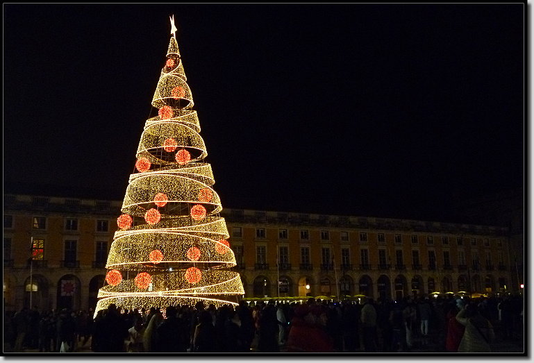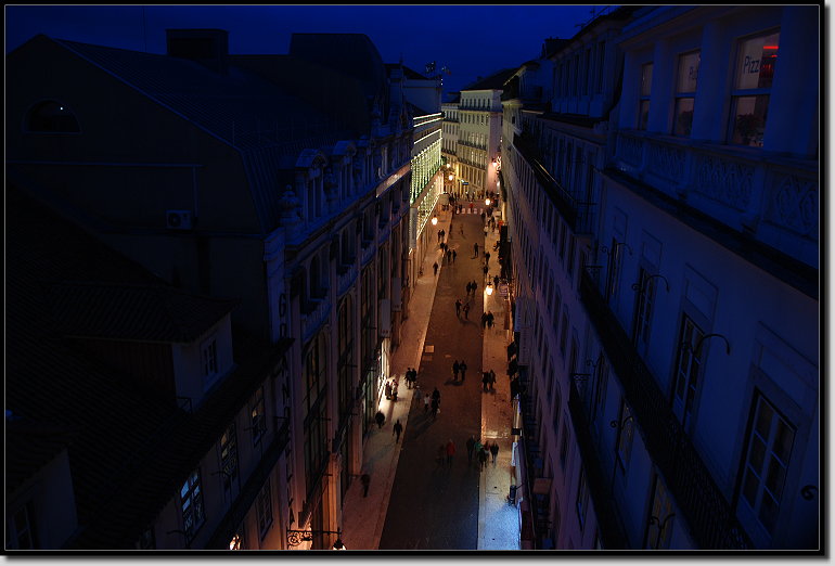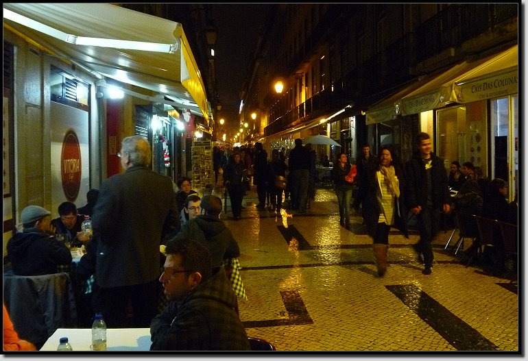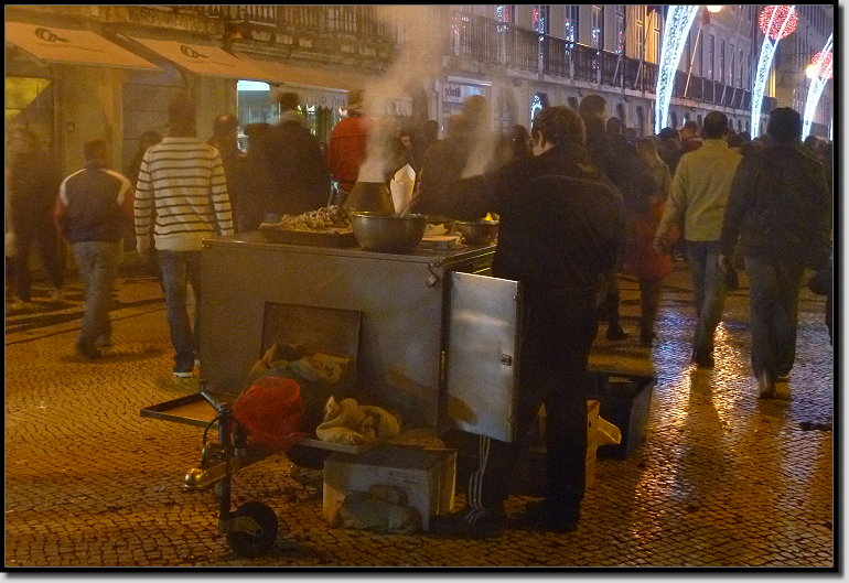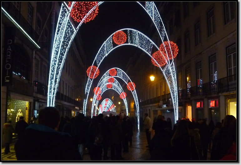Erst gegen 19:30 Uhr trafen wir uns wieder mit Mama an der Rezeption. Zusammen fuhren wir mit der Metro in die Stadt. An der Haltestelle „Baixa-Chiado“ stiegen wir aus und spazierten die vom Regen nassen Treppenstufen nach oben. Da standen wir also im schachbrettartig angelegten Stadtviertel Baixa. Rechts und links der schnurgeraden Straßen stehen hohe gleichförmige Häuserblocks, in denen sich unten Geschäfte und Restaurants und oben Wohnungen befinden. Eine wunderschöne Weihnachtsbeleuchtung tauchte alles in ein traumhaftes Licht und der Duft frisch gerösteter Maronen lag in der Luft.