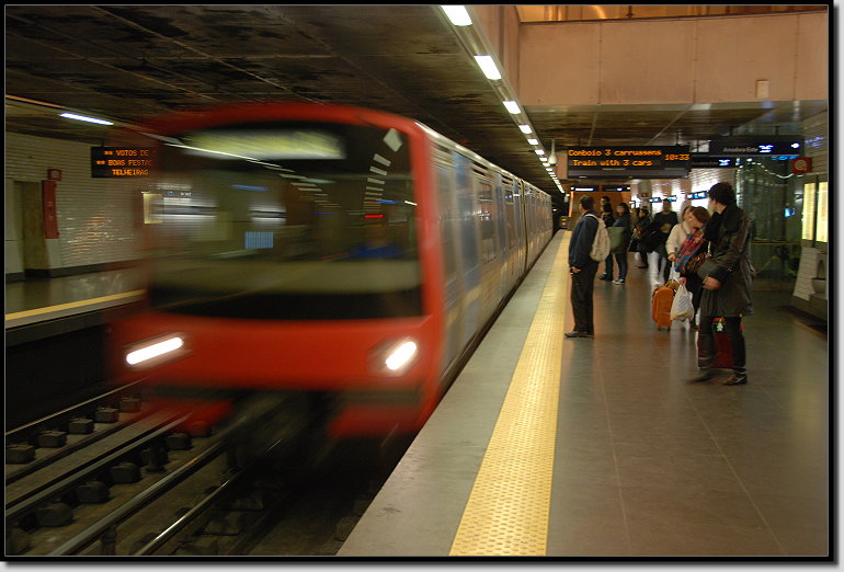 Sanft setzten wir auf portugiesischem Boden auf. Ein paar Minuten mussten wir dann aber noch warten bis die Türen aufgingen und wir an die frische Luft kamen. Ca. 15°C warme Luft erwartete uns. Mit dem Bus fuhren wir zum Terminal und mussten dort erst mal ein Stück zu den Gepäckbändern laufen. Nach kurzer Zeit hatten wir unsere Koffer und gingen zur Metro Station runter.