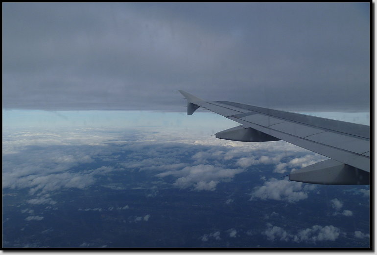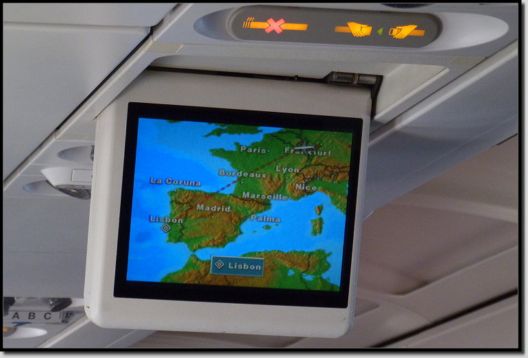 Draußen hatten sich in der Zwischenzeit immer mehr Wolken gebildet. Das hatte der Wetterbericht für Lissabon leider auch so voraus gesagt. Schade… Beim Landeanflug glitten wir dann durch eine dicke Wolkenschicht, die wie ein Deckel auf einem Kochtopf über der Landschaft lag. Darunter gab es noch vereinzelt ein paar Wölkchen zu sehen. Na, die hätten mir eigentlich gereicht.