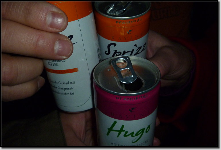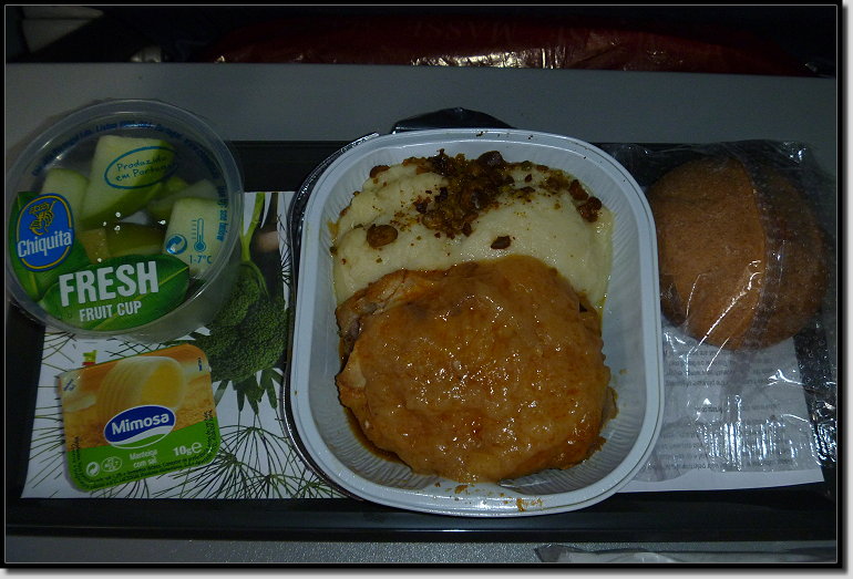 Das Zeug in der Schale entpuppte sich als Kartoffelbrei mit einem Stückchen Hühnerschenkel mit Knochen. Mmh, mit dem ollen Plastikbesteck war das ganz schön blöde zu essen. Warum um Himmels Willen serviert man das nicht OHNE Knochen?? Geschmacklich war es zumindest ok und viel Hunger hatten wir eh nicht.