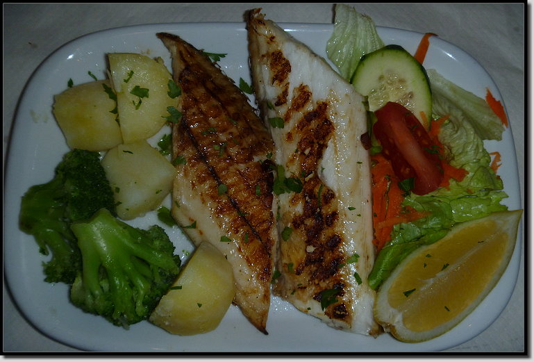 Vor den kleinen gemütlichen Restaurants standen draußen Tische und Stühle und viele Plätze waren belegt. Auch wir suchten uns ein schnuckeliges Lokal aus und fanden noch einen Tisch in der hintersten Ecke. Es war voll und wuselig, was dem Ganzen aber eine besondere Atmosphäre gab. Uns gefiel es und das Essen war super. Nach köstlichen Vorspeisen (Tintenfisch und Croquetes) gab es oberleckeren Degenfisch und Zackenbarsch für Tom und mich. Das alles spülten wir mit zwei Litern Sangria runter. Prost! Mama hingegen hatte Fleisch bestellt und war leider nicht ganz so zufrieden wie wir.