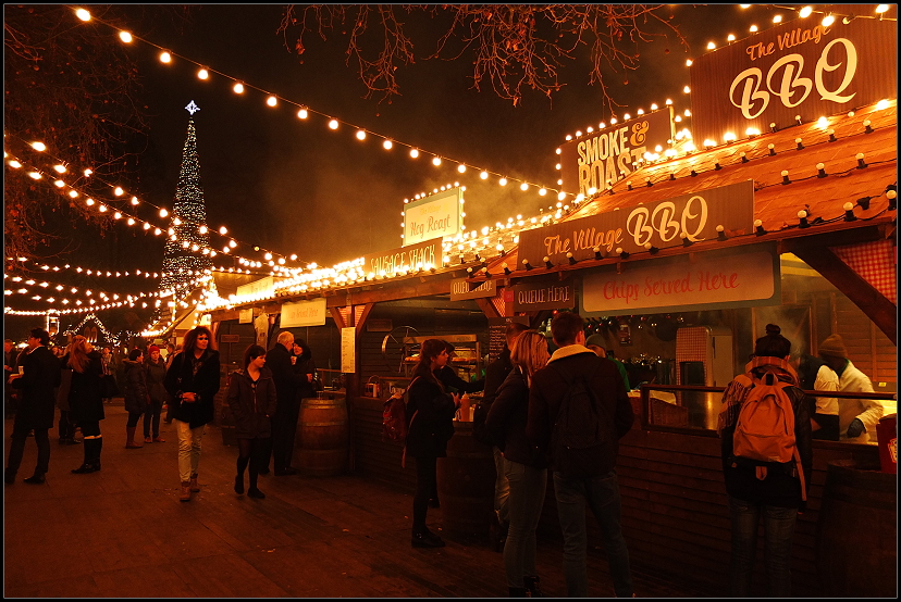 Voll mit Geschichtsdaten tauchten wir wenig später ins „Winter Wonderland“ im Hyde Park ein. Wow, diese Mischung aus Kirmes, Weihnachtsmarkt und Oktoberfest war echt crazy. An jeder dritten Bude gab es „German Bratwurst“ oder „German BBQ“. Dazu „Original German Stollen“ und „German Beer vom Fass“! Aber zum Glück auch viele andere Essens- und Getränkebuden mit leckeren Sachen. Dazwischen kleine weihnachtliche Handwerks- und Verkaufsstände.