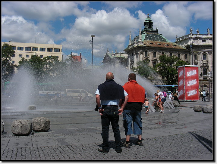 Plötzlich hieß es „hier steigen wir mal aus“ und holtadipolta standen wir Vier auf der Straße und der Bus fuhr weiter. „Hast du den Reiseführer?“, hörte ich Tom fragen. Nee, warum? Den hast du doch… Leider nein, unser Reiseführer lag noch im Bus und zog jetzt einsam seine Kreise durch München…