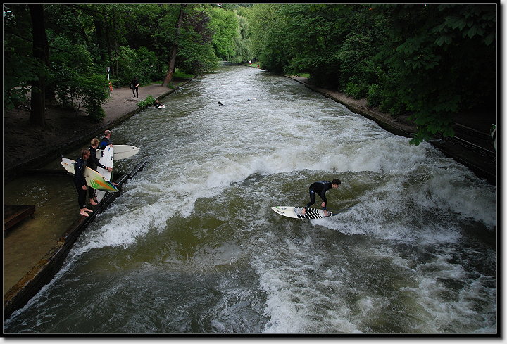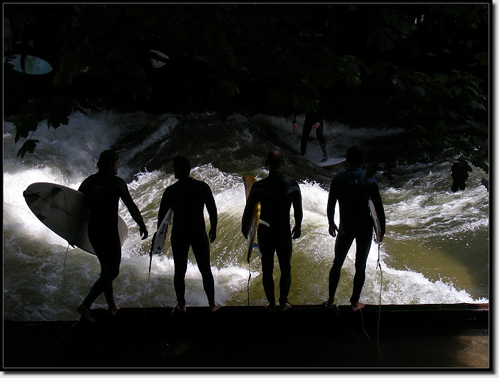 Mit der U-Bahn fuhren wir weiter zum Englischen Garten. Unser erstes Ziel war der Eisbach. Hier findet man hinter einer kleinen Brücke eine stehende Welle, die durch eine Steinstufe erzeugt wird. Seit Jahren wird diese von Surfern genutzt und seit 2010 endlich auch legal! Eine ganze Weile schauten wir uns das Spektakel an, bevor wir weiterzogen.