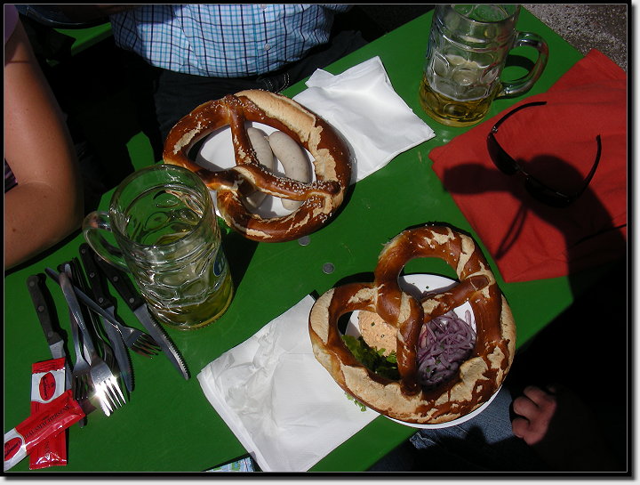 *grummel* Ah ja, Essen! Da war ja noch was. Heute fanden wir ein nettes Lokal direkt an der Frauenkirche und suchten uns draußen einen freien Tisch. Gut, die Bedienung hätte etwas aufmerksamer sein können und Toms Haxe war ziemlich mickerig, aber im Großen und Ganzen war es ganz o.k. Zumindest wurden wir satt. Als es langsam immer frischer wurde, machten wir uns auf den Heimweg zum Hotel.