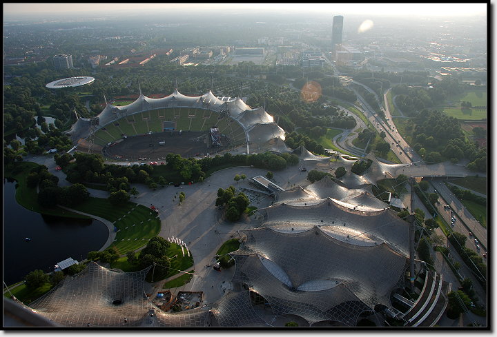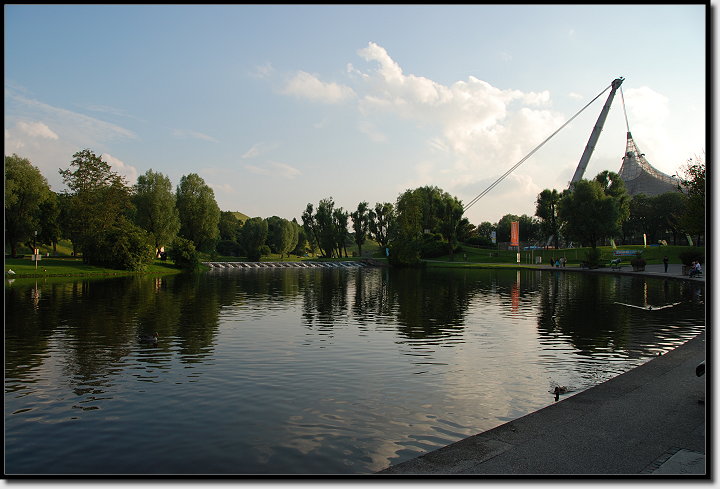Auf dem Viktualienmarkt setzten wir uns unter die großen Bäume und tranken etwas. Anschließend schlenderten wir noch eine Weile umher und schauten an ein paar Ständen vorbei. Über den Marienplatz spazierten wir zurück zur Bushaltestelle. Leider kam ein anderer Bus ohne Monika und ohne unseren Reiseführer. Weiter ging die Sightseeingtour. Unser nächster Stopp war der Olympiapark. Am Ufer des kleinen Sees aßen wir Hot Dog und tranken Kaffee, um uns für den Aufstieg auf den Olympiaturm zu stärken.