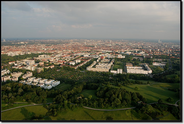 Für 4,50 Euro pro Person fuhr uns ein Fahrstuhl rasend schnell nach oben. Von hier hatten wir eine tolle Aussicht auf München. Die Stadt sieht von oben erstaunlich grün aus.