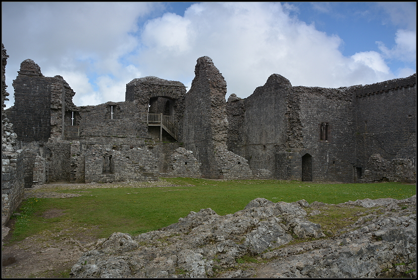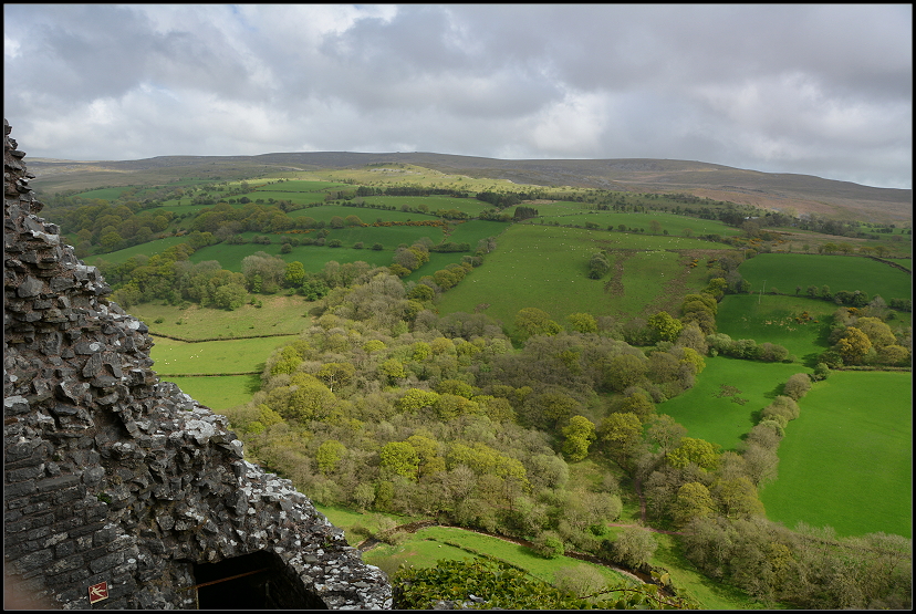 Carreg Cennen war dann das zweite Ziel. Die im späten 12. Jahrhundert errichtete Burg war schon von weitem sichtbar. Sie wurde auf einem 100 Meter hohen Kalksteinfelsen erbaut, der aus der grünen Landschaft empor ragt. Nach dem Bezahlen (4 Pfund, 5,60 €) spazierten wir ihn langsam hoch und genossen die wunderbare Aussicht.