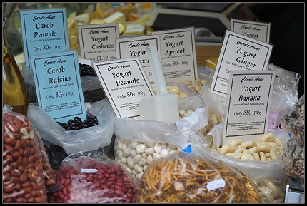 Eine Stunde später machten wir uns dann auf den Weg nach Abergavenny y Fenni. Die alte Stadt ist für ihre Märkte bekannt, die es dort schon seit 1254 gibt. Praktischerweise war an diesem Tag (immer dienstags) großer Markttag in der beeindruckenden Market Hall, die unser Ziel war. Über 200 Stände drängten sich in und um die Halle herum, es war eine quirlige Atmosphäre. In der Luft hingen die unterschiedlichsten Gerüche. Da rochen wir gebratenen Fisch, leckeren Kaffeeduft, frische Blumen und herrliche Gewürze. Neben den Essensständen gab es natürlich noch eine Menge anderer Buden.
