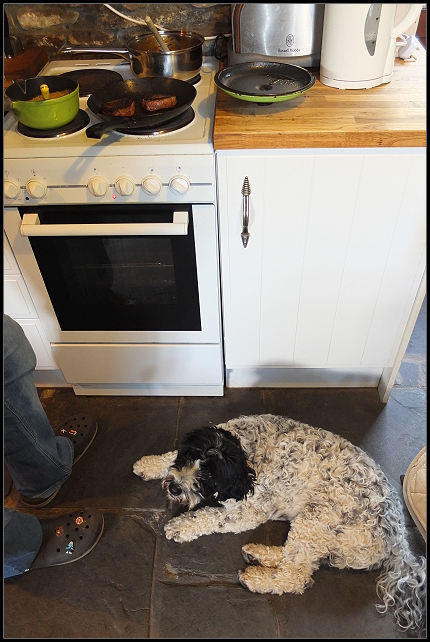 Auf dem Rückweg hielten wir kurz bei Morrisons und kamen gegen 19:00 Uhr im Cottage an, wo wir es uns gemütlich machten. Besuch bekamen wir auch noch, der Hund der Hausbesitzer schaute kurz vorbei. Er roch bestimmt die Steaks in der Pfanne!