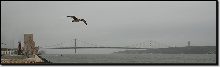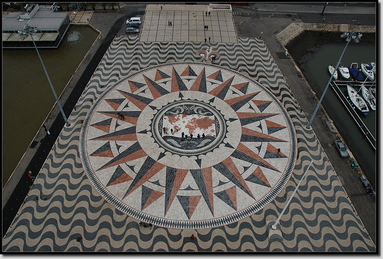 Für 3,- Euro fuhren wir mit einem Aufzug nach oben und konnten von dort auch besser das riesige Marmormosaik auf dem Boden vor dem Eingang erkennen. Es war ein Geschenk der Republik Südafrika und zeigt die portugiesischen Entdeckungsfahrten rund um den Globus. Windig war es dort oben überhaupt nicht. Eigentlich hatten wir gedacht fast wegzufliegen, aber der Wind schoss so gekonnt das Denkmal hoch, dass direkt auf der Aussichtsterrasse nichts zu spüren war. Wenn wir aber unsere Hand über die steinerne Brüstung hielten… Wow, was für eine Kraft der Wind dort hatte!!
