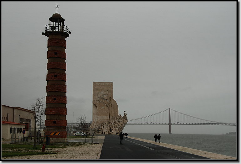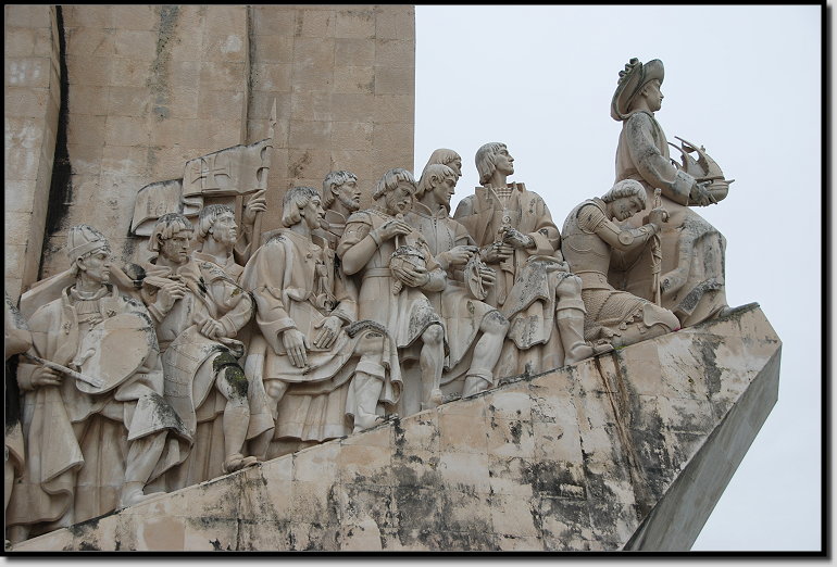 Eine Innenbesichtigung schenkten wir uns und schlenderten stattdessen das Flussufer entlang zum 50 Meter hohen Denkmal der Entdeckungen. Ein kräftiger Wind schubste uns regelrecht in diese Richtung. Das Denkmal wurde 1960 zum 500. Todestag Heinrich des Seefahrers errichtet. Er und weitere wichtige Persönlichkeiten aus der Zeit der Entdeckungen schauen in Stein gehauen auf den Tejo.